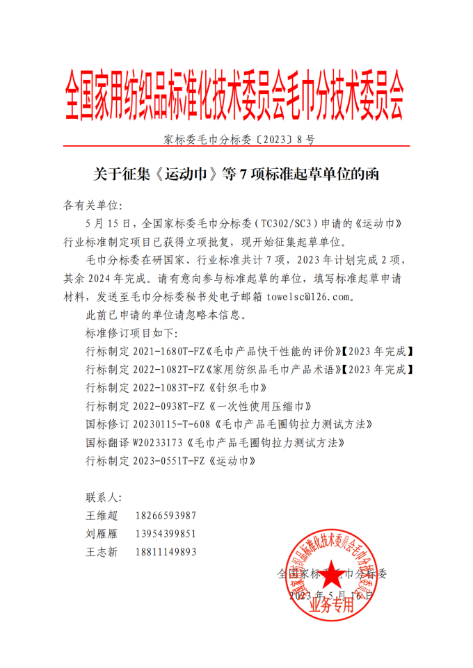 关于征集《运动巾》等7项标准起草单位的函