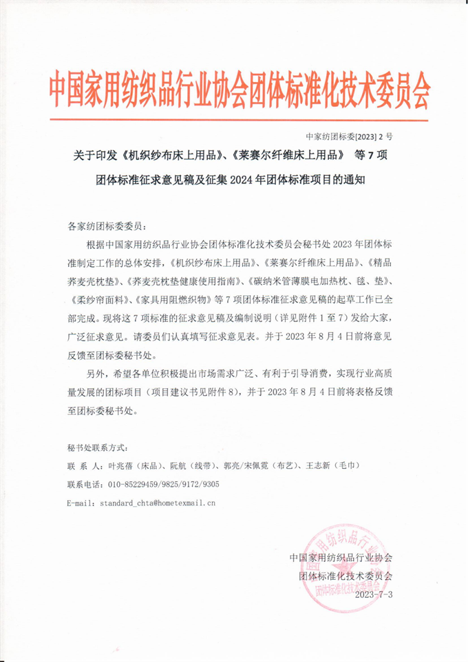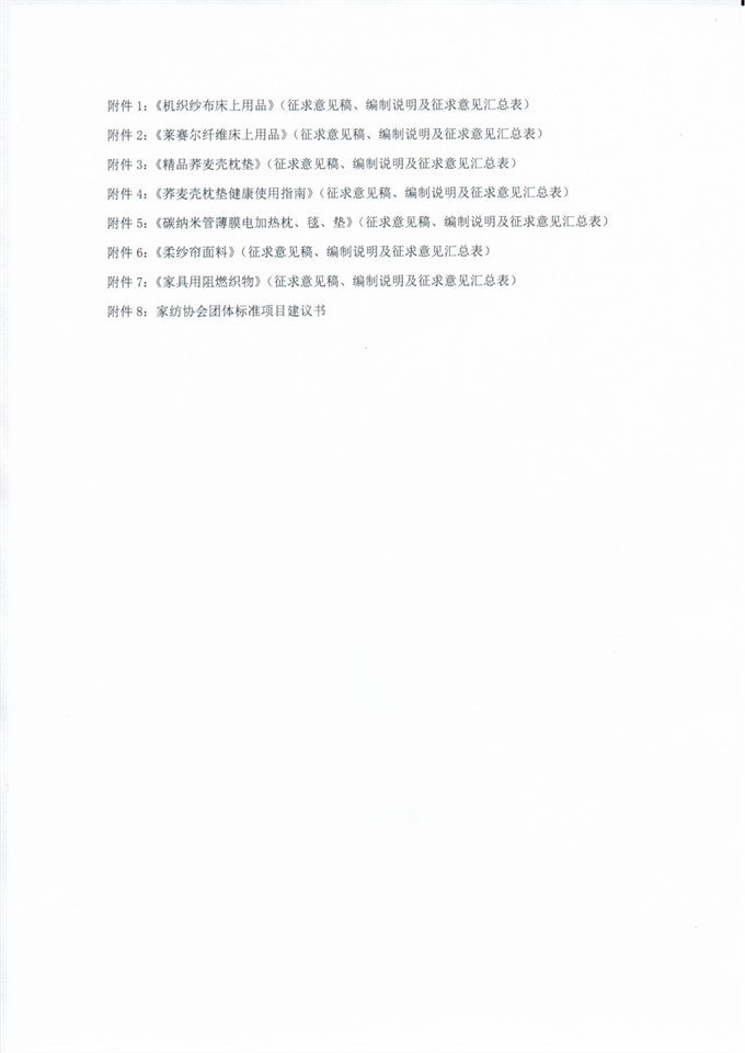 附件2:《莱赛尔纤维床上用品给》征求意见稿、编制说明及征求意见汇总表.docx 附件3:《精品荞麦壳枕垫》征求意见稿、编制说明及征求意见汇总表.docx 附件4:《荞麦壳枕垫健康使用指南》征求意见稿、编制说明及征求意见汇总表.docx 附件5:《碳纳米管薄膜电加热枕、毯、垫》征求意见稿、编制说明及征求意见汇总表.docx 附件6:《柔纱帘面料》征求意见稿、编制说明及征求意见汇总表.docx 附件7:《 家具用阻燃织物》征求意见稿、编制说明及征求意见汇总表.docx 附件8:家纺协会团体标准项目建议书.docx