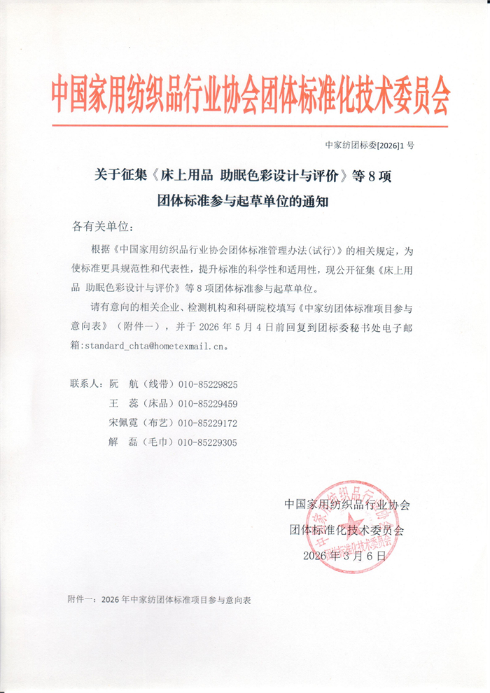 关于征集《床上用品 助眠色彩设计与评价》等8项团体标准参与起草单位的通知